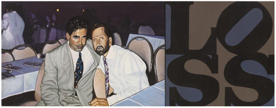 But when I saw him, he was gaunt, he was pale. He was such a muscular guy, Italian, good looking, but he was swimming in his white shirt, and we took this picture, and that was the last time I saw him alive. So I did this painting to honor him. I tried to capture that I was upset, I was angry, that this is my friend Peter. Even though I was glad to see him. But when I moved to my new studio and we were placing things around, I put this up on a shelf and the Loss painting next to it, and I thought, you know what, that looks so good together, like a diptych (Figure 11). And in case people don’t get My Friend Peter, that will provide the subtext and it’s actually inspired me to consider doing some more like this where I might do diptychs that juxtapose the Loss next to individuals and friends taken from old photographs.