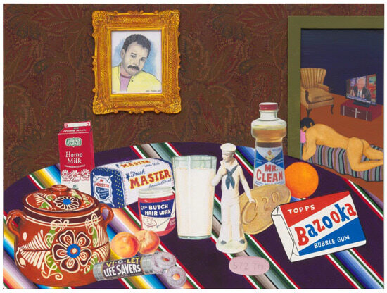 My usual approach to making my paintings was to work from a single photographic source. So I’d have one image that I would use. I was trying to figure out how I could create paintings about my ambivalence regarding the age of the HIV cocktail and my place in it, and where HIV and HIV meds have now landed in society or popular culture. I just couldn’t figure it out, but one day sitting at my breakfast table with my Cheerios and my HIV meds on the table in front of me, I thought, “Oh, this is funny, it looks like a Tom Wesselman still life from the 1960s”, in which he juxtaposed different images and logos of American products, that at the same time celebrated Post World War II American consumerism but also was critiquing American consumers’ tendencies. And I thought, “Oh, I’ll do a parody, and that’s the way that I can do still lifes with these HIV meds”. But in mine I wanted to both Mexicanize and queerize my versions, so that no one would mistake them for—you know, not that I would be mistaken for [the artwork of American painter] Tom Wesselmann. But anyway, this is the first one that I did. That’s part of why I have juxtaposed those American products but then put either chocolate or galletas or some aspect of Mexican culture.