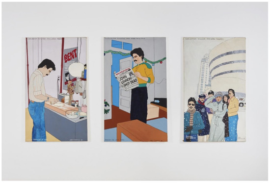 Joey Terrill, the three panel series: Making Tortillas in Soho, Reading the Local Paper, Searching for Burritos, acrylic and metallic paint on canvas, each of the three panels is 60 × 36 inches, 1981. Collection of the Museum of Modern Art. Reproduced with permission from the artist.