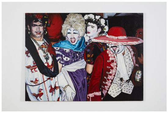 Then this one here is called Jef, Victor, Luiz and George (Figure 19). Jef and Luiz have flowers in their hair and they’re partners to this day and they came dressed as the painting Las dos Fridas. If you look closely you can see they have these velvet hearts on their chest and then there’s plastic tubes which replicate the veins of blood. When someone would say, “okay I’m gonna take a picture”, they would sit and pose like the painting. But in my painting they are not posing, this is a very candid shot. And so right there, the back of the head with the red hair in a big beehive hairdo, that’s Arnie, who designed the shirt over there who used to sell his things at Jef’s shop, because Jef was a designer as well. And then Victor Durazno was a dancer for the Ballet folklórico. We grew up in Los Angeles and he was one of my best friends since we were teenagers. He’s the one with whom, when I moved to New York, we lived with. This scene is back in LA though. And then Luiz, Jef’s partner, was also a teacher at L.A. Unified School District. He was also a musician in a band called Fat and Fucked Up. And they would play these punk clubs. Fat and Fucked Up would come out and they were a quartet. Someone played a bass and Luiz would be there playing the violin and the crowd loved them. It was such an incongruous musical form for the punk clubs. Anyway, Victor and his partner, George, they kind of came as Italian Renaissance royalty. Victor died about seven years ago from cancer.