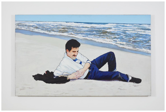 Then this is the most recent painting in the group. This is from 2015 and it is titled My Last Day in New York, Fire Island—1981 (Figure 20). When I was about to fly back to LA to go back to California, to go back to Rick, I was contemplating, “am I doing the right thing, I’m not sure, blah blah blah”. I had two co-workers that had said, “Hey Joey, have you gone to Fire Island [a gay vacation spot] since you’ve been here?” I said, “No”. They said, “Come on, we’re gonna take you down there”. We went on the subway and took a ferry. We got down there and they were just taking pictures of me. I wasn’t even aware that they were doing that but it was off season and the sea was kind of choppy. So I was in a very contemplative mood at that time, but also unbeknownst to me, I was already infected with HIV. And so these are pictures that were just sitting at home like in a box. Then in 2005 I realized that I was now reaching the point when I was infected with HIV when I was 25, and now I will, from this point forward, be living with HIV longer than I had been living without it. And it did a number on me. I was like, wow, that is amazing. So I started to look at old pictures from when I was living in New York back in 1980 and ‘81 and that is when I started to use those images for paintings in the 2000s kind of just referencing the New York days.