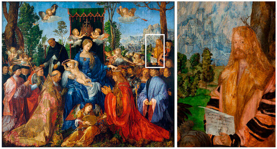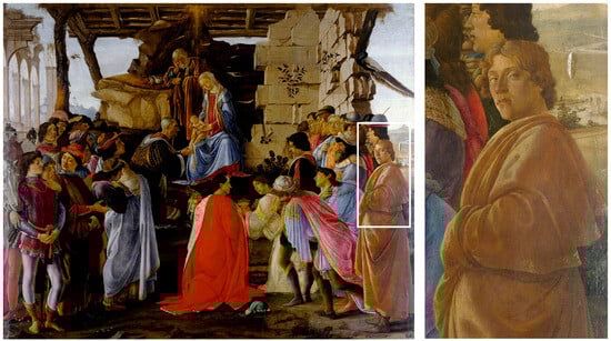 The Adoration of the Magi, commissioned from Botticelli by the banker Gaspare Zanobi del Lama for his family chapel in the Santa Maria Novella church in Florence (Figure 1), is one of the most celebrated examples of this. In the composition, the painter placed himself on the far-right side, making direct eye contact with the viewer. This artistic device of a gaze toward the observer, lateral position, and specific attitude—all are indices of discretion and compositional integration yet at the same time of distinction, serving to ensure firm recognition of the individual who has been represented (Laboury, personal communication, 10 August 2023)—is well known and acknowledged in dozens of artworks from that period (Figure 2 and Figure 3).