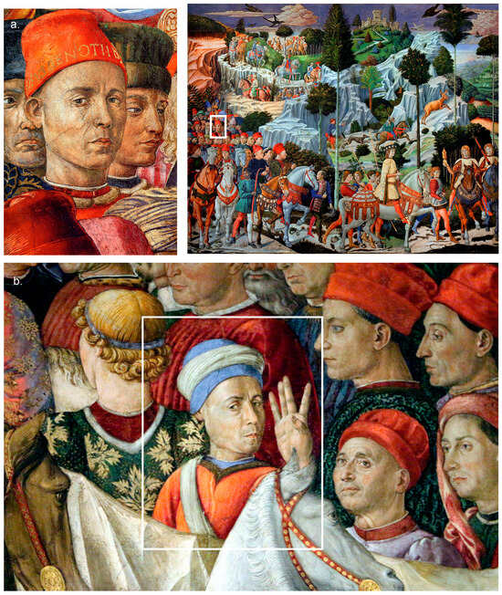 TExchanging eye contact with the observer is a powerful message, immediately grasping the audience’s attention, and is made all the more emphatic when the portrait is recognized, as if declaring that “what you see is by my mind and by my hand”.6 Additional indicators are sometimes provided: in the case of Benozzo Gozzoli’s self-portrait (Figure 2a), he wears a red hat inscribed with Opus Benotii, “Benozzo’s work”, to be considered a signature proper and, at the same time, as a pun on words plausibly communicating that the author wants this fresco cycle—and himself—to be ben noti (well noted) by a viewer (Ames-Lewis 2000, p. 228). On the cycle’s opposite wall, where the retinue of another Magus is represented, beside the painter’s inserted likeness we see the raised right hand (of an individual depicted next to him), calling attention to the concept of recta manus: the skillful hand that made the opus in question (Ames-Lewis 2000, pp. 215–16).