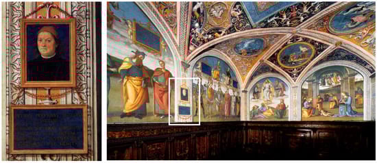 It is broadly recognized in art history that self-promotion is the meaning of a self-portrait in assistenza (Chastel 1971, p. 537 uses the expression “glorification”), underscoring the artist’s practical, intellectual, and even social positions (Ames-Lewis 2000, pp. 228–34, 239–43). One can consider an additional motivation: pride in creation, the ability to bring an image into existence, and the sense of being somehow unique in this respect. An inscription attached to another self-portrait, included in frescoes in the Colleggio del Cambio in Perugia (Figure 4), reads: “Pietro Perugino, celebrated painter. If the art of painting became lost, he would restore it. If it had never been invented, he alone could bring it to this point” (Ames-Lewis 2000, p. 2018).