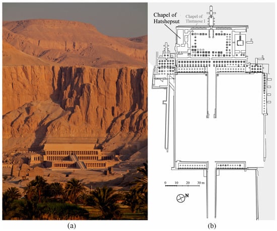 With the Temple of Hatshepsut harmoniously integrated within Deir el-Bahari’s rocky landscape (Figure 6a), the building process is considered to have lasted through this female pharaoh’s entire reign (ca. 1473–58 BC: Roehrig et al. 2005, p. 6), i.e., approximately 15 years (Arnold 1975, col. 1017 with n. 6). Senenmut—the most prominent individual at Hatshepsut’s court (for his career overview, see Helck 1958, pp. 356–63, 473–78; Ratié 1979, pp. 243–64; Dorman 1988, passim, esp. 165–81; 1991; 2005, pp. 107–9; Roehrig 2005b, pp. 112–13; Shirley 2014, pp. 188–93; Allon and Navrátilová 2017, pp. 25–39)—is the person usually considered its architect and by extension the designer of its decoration. The most explicit declaration of Senenmut’s involvement in Hatshepsut’s building projects is found on his statue from Karnak (CG 579):
