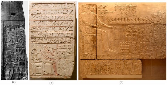 Variations on a theme of the deceased at the offering table: (a) panel of Hesyra, Third Dynasty, c. 2667–40, cedar wood, Cairo CG 1426 (Quibell 1913, Pl. XXI); (b) funerary stela of Megegi and Henit, Eleventh Dynasty, c. 2059–51 BC, limestone, The Metropolitan Museum of Art, Acc. No. 14.2.6; (c) relief decoration from the offering room of Ramses I at Abydos, c. 1295–94 BC, The Metropolitan Museum of Art, Acc. No. 11.155.3a.