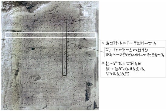 Autobiographical stela of Djehuty (Marquis of Northampton et al. 1908, Pl. 1); detail: line 5 of the text mentioning Djehuty’s work in the Temple of Hatshepsut and the “refrain” column (Urk. IV, 422.6–11).