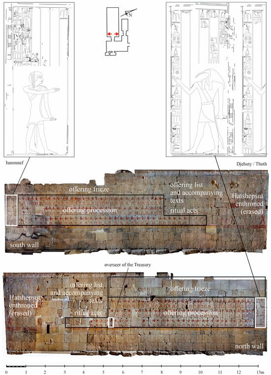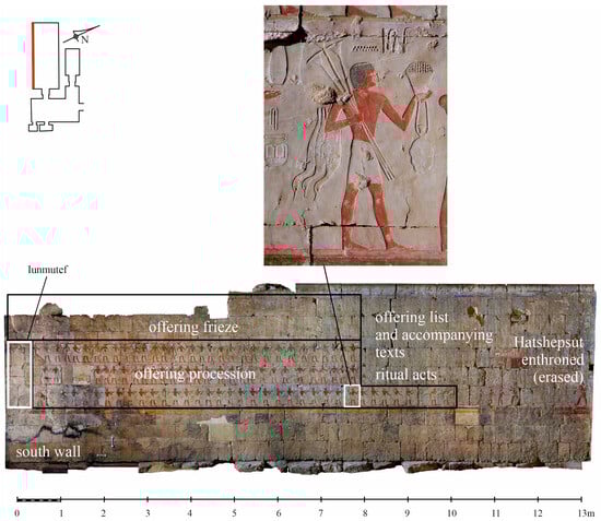 In what follows below, the aim is to present one person who is detectable, as I will argue, in his role in designing the decoration in one of the temple rooms. This is by no means intended to advocate the view that this person was the sole designer even in this single room, as will be demonstrated. The room that will be focused on is known as the Chapel of Hatshepsut, located on the temple’s third terrace (Figure 6b) and intended for Hatshepsut’s mortuary cult. Its lateral north and south walls are decorated with what are referred to as offering scenes, typical of this type of cult space (Stupko-Lubczynska 2016b).