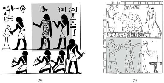 A sem-priest and a lector-priest (highlighted in grey) in the representation of the ritual acts performed in front of the deceased; (a) the tomb of Khnumhotep at Beni Hassan (BH 3), Middle Kingdom (drawn by the author after Newberry 1893, Pl. XXXV, detail); (b) the tomb of Antefoqer/Senet, TT 60 (drawn by the author after Davies 1920, Pl. XXVIII).