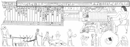 In Old Kingdom offering scenes, figures appearing in the procession represented real people (Jéquier 1938, pp. 57–63) and are labeled with their name and relevant titles (Figure 10). The Chapel of Hatshepsut decoration exemplifies over a millennium of tradition in decorating this type of room. Here too, long lateral walls are adorned with codified offering scenes of classical composition and content, differing in that the offering bearers, precisely one hundred on each wall, all lack names, their titles seeming to be random choices in most cases (Stupko-Lubczynska 2016b, pp. 260–73; some exceptions are noted below), with 12 figures having no title at all.