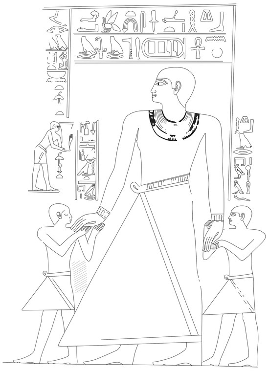 In ancient Egypt, in contrast to the communis opinio about anonymity in its art noted above, dozens of artists’ signatures have been recorded, many of them categorized as self-portraits in assistenza (for an overview and examples, see Oppenheim 2006, p. 216, n. 3; Laboury 2015, passim, esp. nn. 1 and 4; notable earlier studies on the matter are Ware 1927; Junker 1959; see also n. 4 in this paper); and yet, the number of identified artists remains low compared to the quantity of preserved ancient Egyptian artworks that were never signed.7 One of these signed works (Figure 5) is an oft-cited case of Seni of the Old Kingdom, the painter (sS qd(wt), “scribe of forms”) claiming to have decorated a governor’s tomb at Akmim being alone (wa.kw) (Kanawati and Woods 2009, pp. 9–10; Laboury 2012, p. 201; 2016, pp. 379–81; Laboury and Devillers 2023, pp. 172–73).