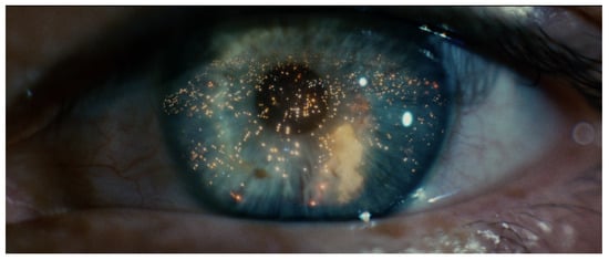Sounds imply movements, visuals, and specify the relationship between the spectators and the diegesis. Percussions are used as sound effects rather than being integrated into the melody. Relying on the semiotic associations of cymbals, horns and percussion with pageantry, the military and the hunt (Kalinak 1992, p. 13), such instruments conjure visuals, just like horns bring about the beginning of a battle. Cymbals and chiming sounds are played in an ascending arpeggio, as if they were unfolding the columns of fire; extra-diegetic music seems to gain power over images, for the sole purpose of unfolding a hellish spectacle in front of the camera’s single eye, and behold! An eye appears on the screen (Figure 2; 0:03:49). The spectacle of the city from the sky, presented by the previous shots, is reflected in this eye, subsequently conflating it with that of the spectator. Percussions therefore not only conjure images on the screen, but the spectators themselves. Music brings about the fusion of the spectators’ eyes with the camera in a self-reflexive way and, in doing so, that which is technological is anthropomorphised—the camera becomes an eye.