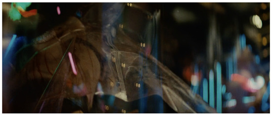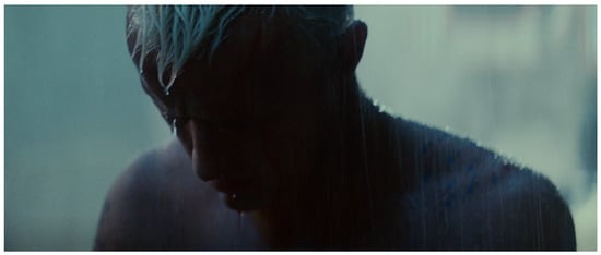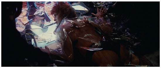 Deckard shoots a second time, and Zhora breaks through another set of glass doors; her mouth gaping, synthesizer music starts synchronously, replacing her scream (0:55:21). Zhora’s scream becomes a ‘screaming point’, a point of convergence where the plot of the film is ‘consumed and dissipated, in the unthinkableness and instantaneity of the scream…The woman’s scream has to do with limitlessness. The scream gobbles up everything into itself’ (Chion 1999, pp. 76–79). In the face of death, Zhora’s scream is an explosion, expressive of everything that she is and everything that she could be—displayed through the various neon lights reflected by the materials that Zhora is associated with (glass, transparent plastic, bubbles). Visually, she becomes undefined, her movements slowing down and coming to a rest like the mannequins surrounding her in the shop: she dies as an object. However, by synchronizing music with her scream, Zhora dies as a human being; even more so, the music ends with rubato duets made of notes descending the chromatic scale, mimicking not only the falling of synthetic snow in the display case, but also Zhora’s fall. Face down on the ground, her hands spread around her body, the bullet wounds in the shoulder blades (Figure 5; 0:56:24), Zhora is designated sonically and visually as an angel whose wings were cut off, and whose fall was provoked by Deckard.