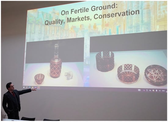 The penultimate speaker was Chris Blade5, the CEO of Cumbria Crystal, who stands at the helm of one of the last bastions of hand-blown and hand-cut lead English crystal production. He was able to introduce the diverse roles he has held in the fields of glass design, manufacturing, project management, and education. He earned a Master’s in Glass from the Royal College of Art in 1987 and went on to establish his first design and manufacturing business in 1988, in London. His expertise in advanced manufacturing has been a driving force at Cumbria Crystal, which has seen the successful execution of over 500 bespoke commissions for several esteemed clients. He was able to navigate his talk through examples of a complex set of commissions and design projects that reflect his deep understanding of both the design principles and manufacturing intricacies of cut crystal production. He showcased collaborations with the British Embassies, Royal Families, and luxury brands such as Bentley Mulliner. Through his talk, he was able to share both his commitment and passion for cultivating knowledge and nurturing the next generation of talent within the creative industries. As the CEO of Cumbria Crystal, he was able to show how he champions the heritage of handcrafted English crystal, while pushing the boundaries of design and manufacturing in this field. In his talk, Blade was able to introduce the fascinating story of Cumbria Crystal, a distinguished cut crystal brand that preserves centuries-old traditions in the heart of the Lake District (Figure 11).