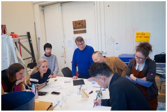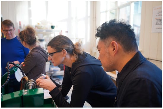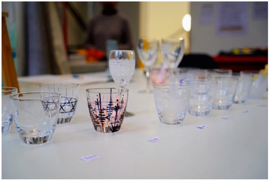 A three-day masterclass workshop with Toru Horiguchi, held at ECA, preceded the conference, and a range of the work created by the staff and students was also shown during the conference, in a curated exhibition (see Figure 16, Figure 17, Figure 18 and Figure 19). During the masterclass, Toru Horiguchi was able to share his vast skills and knowledge of cut crystal and the fine art of the Edo-Kiriko tradition with staff and students at ECA. This culminated in a cross-cultural exchange and a modern-day skills transmission, an act that sees the lost art of cut crystal being reintroduced to this group of Scottish glassmakers. The workshop participants were encouraged to try out diamond lathe cutting, many for the first time. They first drew out their ideas as sketches, and Horiguchi helped them to measure out and mark up the desired patterns accurately onto the glass before they were finally realised by cutting into the glass using a diamond cutting lathe (see Figure 22, Figure 23, Figure 24, Figure 25 and Figure 26).