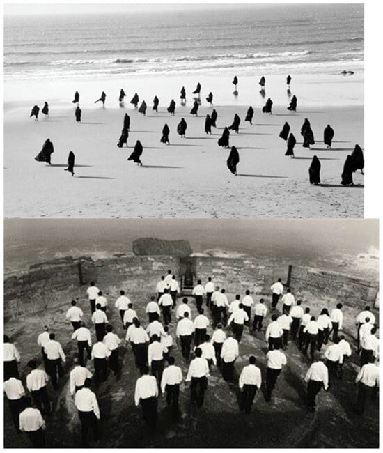The visual juxtaposition of the enclosed, fortress-bound men and the woman in the open seascape creates a dynamic tension between the two screens. The men, though positioned within a structure of power, appear trapped and isolated, while the women, despite their apparent vulnerability in the open landscape, embody a sense of resilience and determination. The wind that sweeps across the landscape, lifting the women’s chadors, adds a sense of movement and vitality to their screen, contrasting with the static, rigid environment of the men (Figure 5).