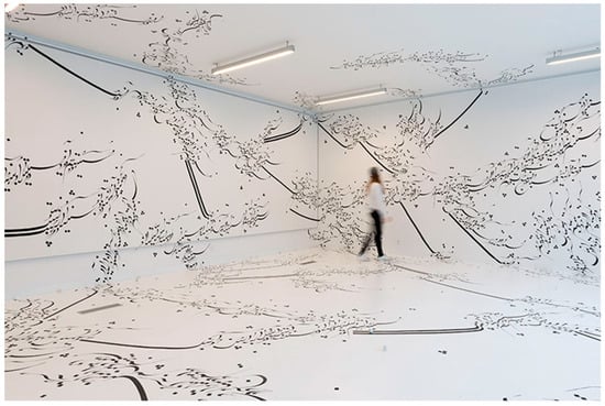 In “Written Room”, Forouhar envelops the entire gallery space with dense Persian calligraphy, covering every surface—walls, floor, and ceiling. This immersive installation forces viewers to navigate an ocean of text, symbolizing the inescapable and overwhelming nature of cultural and political narratives that dictate societal norms. The calligraphy, intentionally illegible to many viewers, represents the complex and often oppressive forces that shape women’s identities, particularly in a patriarchal society. However, Forouhar’s work also speaks to the broader colonial gaze that seeks to render non-Western identities inscrutable and alien. As Tabari (1980) argues, the Western fascination with the veil often transforms it into a symbol of mystery and oppression, obscuring the real lives and stories of the women who wear it. Forouhar’s use of calligraphy challenges this exoticizing gaze, forcing the viewer to confront their own assumptions about legibility, representation, and power (Figure 7).