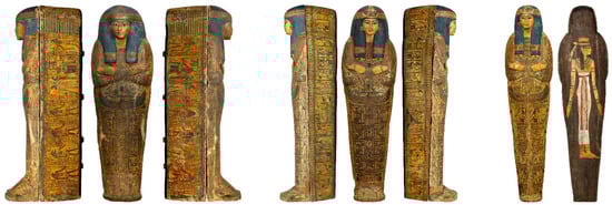 Where no connection between the visual appearance and physical geometry is found, it is clear that the pieces were produced following different styles and were only put together to form a set at a later date or it is indicative of something happening during the production process. This is evident, for example, in the reused objects, which correspond to roughly 21% of the coffins. This interpretation is also supported by other data and studies. Due to the complexity and variety of the types of reuse of the “yellow” coffins and the identification of this reuse, the reliance on traditional methods (iconography, palaeography, craft, and structure) and more recent innovative techniques (archaeometry and imaging techniques, such as X-rays and CT scans) remains fundamental.