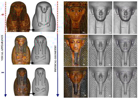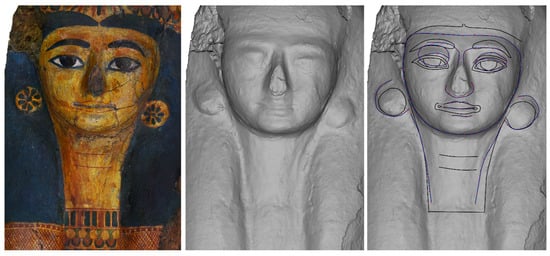 Analysing the forms and geometry of heavily decorated three-dimensional polychrome objects poses challenges, as visual appearance (decoration) often obscures physical geometry (shapes), hindering objective analysis with the naked eye. However, advancements in digital technologies and 3D modelling offer a solution. Photogrammetry enables the creation of a precise, submillimetre, and high-resolution “digital twin” of objects, facilitating a detailed analysis of their forms (i.e., eyes, eyebrows, nose, mouth) without visual interference, making “visible” the “invisible” (Figure 1).