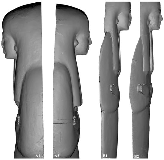 Comparison of the orthophotos without texture of the inner lid of Tanethereret (A1) and Henuttawy (A2) and the mummy board of Tanethereret (B1) and Henuttawy (B2).