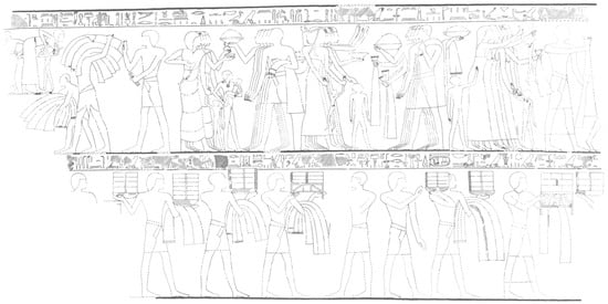 Another example comes from the tomb of Paheri, which depicts foreigners, distinguished by their hairstyles, engaged in the harvesting, bundling, and rippling of flax, an integral aspect of textile production (Morris 2014, p. 371).