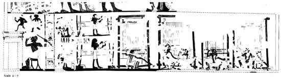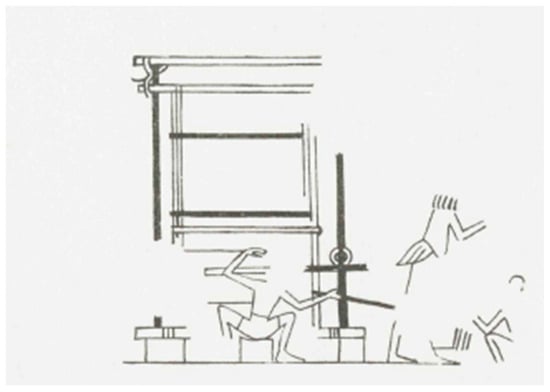 Archaeologically, no pr-šnꜥ workshop has ever been found. However, we do have artistic depictions of weaving workshops in relation to temple and state institutions. One example is from the tomb of Neferhotep (TT49; Davies 1933, Figure 3). He was the “Chief Scribe of Amun” during the reign of Ay. We can see the storerooms of the Temple of Amun with a scribe accounting for goods, including gold, grain, papyrus, wine, oil, and linen (Davies 1933; pl. XLV). Women are depicted with baskets full of bread and linen, making deliveries to the storeroom (pls. XLV, XLVI). At the lowest part of the wall, the temple workshop scenes are depicted. A carpentry shop, bakery, and weaving workshop are depicted (pls. XLV, XLIV). The weaving workshop shows an upright loom, similar to those seen in tombs 103, 104, and 133 (Davies 1933, p. 38). Unfortunately, this part is the most degraded, but line drawings by Hay and Wilkinson are available (Additional MSS, British Museum 29824, pp. 11–15). The looms are upright, with the weavers sitting on stools before them.