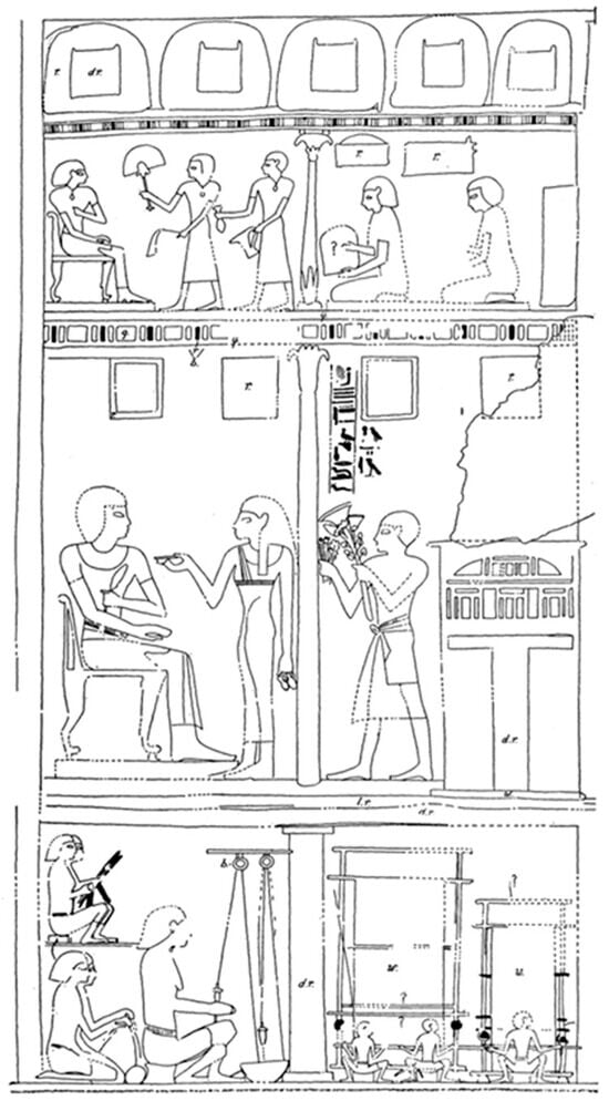 As for a possible depiction of a workshop as described in the Teachings of Khety, the tomb of Djehutynefer (TT104) depicts a weaving installation on the lowest floor of the nobleman’s house (Figure 5). This has typically been interpreted as a basement in the literature, due to its depiction below the ground register line and the thicker wall in the middle of the room (Davies 1929, p. 237).9
