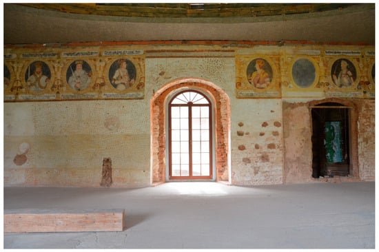 In both palaces, the most interesting and prominent parts of the newly discovered fresco decorations are the cycles of half-length portraits of the emperors of the Roman Empire and the Holy Roman Empire of the German Nation. In Struga Palace, the cycle consists of 27 portraits located in the dining room on the first floor, which is now known as the Imperial Hall (Figure 1).