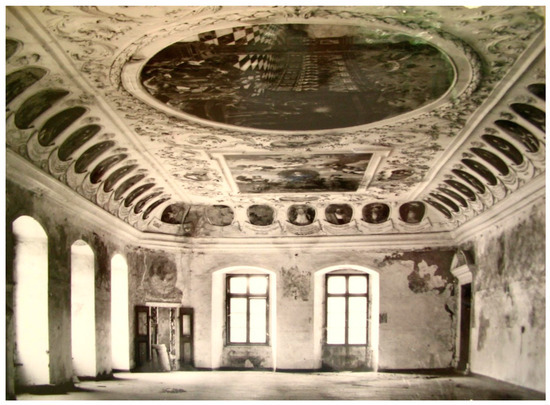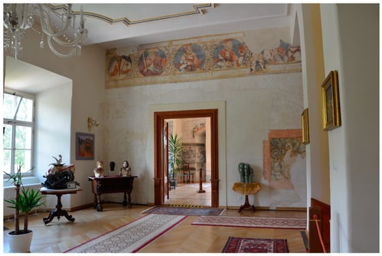 In Ciechanowice Palace, the emperors’ portraits are now located in three rooms on the first floor—which once formed one representative dining hall—and they consisted of approximately 50 representations (Figure 2).