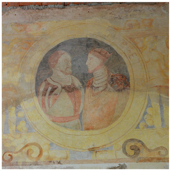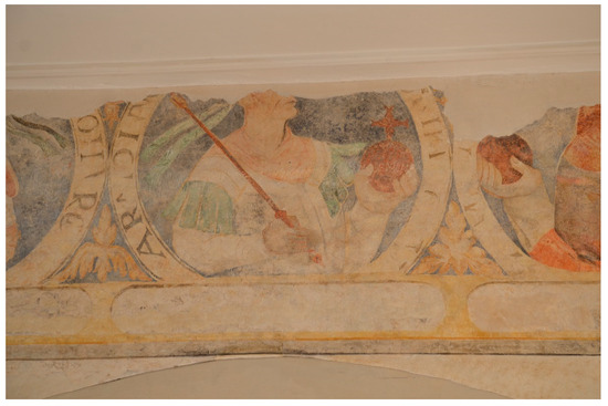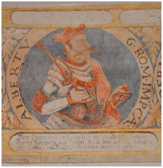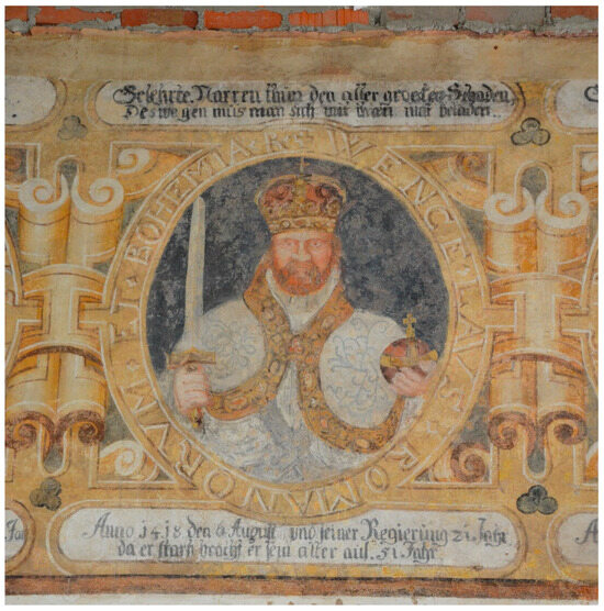 We can compare them only to the portrait galleries of “famous men” (uomini famosi) popular during the Renaissance, which in Silesia were turned into the cycles of oil paintings on canvas, such as the one from the former collection of the Wrocław patrician, Thomas Rehdiger (Steinborn 1977, pp. 29–65). However, in neighbouring Bohemia and Moravia, they were also turned into fresco paintings, with the best example being a cycle of 24 medallions representing well-known personalities of the 16th century—including church dignitaries and rulers, such as the Tsar and the Turkish Sultan—created at the end of the 16th century on the townhouse number 106 in Slavonice (Krčálová 1989, p. 64).
