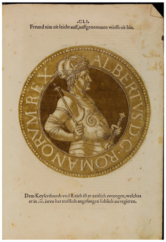 Josse van Gietleughen, Albert II Habsburg, woodcut, in Hubert Goltzius, Lebendige Bilder Gar Nach Aller Keysern […], Antwerpen 1557. Photo from https://doi.org/10.11588/diglit.32333.