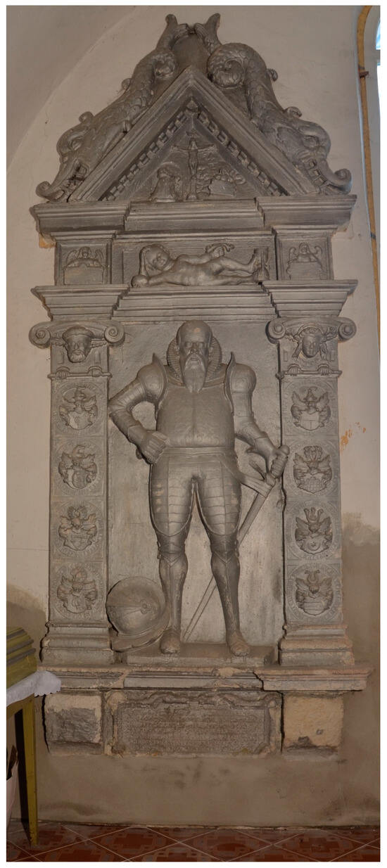 In the 1560s, Abraham von Czettritz und Neuhaus started remodelling the manor house in Struga, as evidenced by the stone plaques with his and his wife’s coats of arms placed at the main portal and the column with a “Tuscan” capital with the date 1565, which is located in the corner room adjacent to the new gate passage (Eysymontt 2010, p. 338). This project was possible thanks to his considerable wealth, as confirmed by the treasury register of the Duchy of Świdnica and Jawor from 1579. Abraham von Czettritz und Neuhaus was also a generally respected man. On multiple occasions, he acted as a witness confirming the legitimacy of the wills of the local noblemen, including Conrad von Hochberg (1554) and Andres von Tschirnhaus (1582). Furthermore, together with his seventeen-year-old son Abraham and two other relatives, he represented the Silesian nobility at the funeral of Emperor Maximilian II, which was held in Prague on 22 and 23 March 1577.