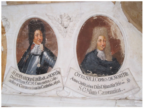 We do not encounter any other galleries of imperial portraits decorating Silesian palaces until the Baroque era. This is when we can find the Personifications of Prudence and Truth painted by an unknown artist on the vault of one of the representative halls of the Württembergs’ castle in Oleśnica at the end of the 17th century, complemented by the depictions of four busts of Roman emperors in the window splays (Katalog zabytków 1983, p. 68, figs. 217, 218). Similarly, the fresco decoration (which was destroyed around 1800) of the Knights’ Hall in the Oppersdorffs’ castle in Głogówek depicted a gallery of Habsburg rulers, a Roman eagle, and personifications of the virtues (Kalinowski 1973, p. 98). However, these works were by no means on par with the imperial series at the palaces in Ciechanowice and Struga. The only work to which they can be compared is the fresco decoration of the Ballroom in Luboradz—created for Count Christoph Wenzel von Nostitz in 1692—with a series of 53 oval bust paintings, not of emperors but of the members of the Nostitz family (Rudnicka 2015) (Figure 11).