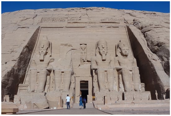 The façade of Abu Simbel (Gaballa and Maher Taha 2001) visualizes the feelings associated with kingship that are articulated on the Twin Stelae in a number of different ways (Figure 1). For example, the emotional and sensorial qualities of kingship that I identified above all relate to the king’s power and the ways in which his power was experienced.17 Similarly, the façade of Abu Simbel manifested royal power. One way that this is visible is through the scale of the four colossi. Their size alone, at over 20 m high (Wilkinson 2000, p. 224), evinces massive strength and power that is congruous with the idea of the king’s loudness and the tremendous presence that it implies, as expressed on the Stelae.