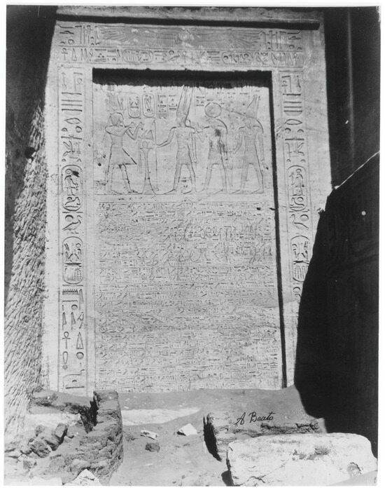 The Twin Stelae flank the entrance into Ramses II’s Great Temple at Abu Simbel (Figure 1) (Kitchen 1999, p. 189). This was the largest rock-cut temple that the king had carved in Nubia (Wilkinson 2000, pp. 223–27). It was dedicated to Re-Horakhty, Ptah, Amun-Re, and the deified Ramses II, all of whom were provided with cult statues in the innermost shrine of the temple.7 Four colossal statues of the king dominate the temple’s monumental façade (Porter et al. 1952, pp. 100–1); (Ullmann 2011, pp. 305–6). The Twin Stelae were carved into the rock face on the outer sides of these statues. Both Stelae consist of an upper scene and a long inscription.8