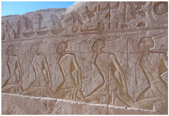 Moreover, the outer sides of the bases of the statues are decorated with images of kneeling bound foreigners carved in sunk relief (Figure 7) (Gaballa and Maher Taha 2001, pls. LXXIX, XCII, XCIII). On each surface, these foreigners are placed in a row, with their backs toward the temple. Their arms are pulled far behind their backs, with their chests sharply jutting forward, thus emphasizing the painful nature of the binding (Prakash, forthcoming). Their bodies also overlap with each other, which may be another cue that Egyptian artists would use to represent pain in certain contexts (Prakash 2021), with the lower leg of each foreigner’s rearmost leg crossing in front of the lower front leg of the foreigner directly behind him. Their facial features and hairstyles are consistent with the stereotypical features that the Egyptians assigned to different foreign ethnic groups (Roth 2014, pp. 162–70), and they are arranged to align with the geography of the temple. The foreigners depicted on the bases of the two southern colossi are Nubians, who lived to the south of Egypt, while those on the bases of the two northern colossi represent different types of northerners. This geographical distinction is further reinforced by the plants that loop around the foreigners’ necks; the Nubians are strangled by lilies, which were traditionally associated with Upper Egypt, while the northerners are strangled by papyrus, which was characteristic of Lower Egypt.