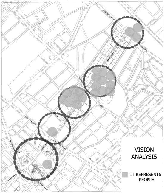 In determining the sensory elements dominated by the street and in the analysis of the sense of sight, the architecture and colors of the buildings around the street, showcases on the street, signs, street art, or other visual elements were effective. In the analysis of the sense of smell, odor elements emitted from businesses on the street were effective; for example, food smells coming from restaurants, bread smells coming from bakeries, etc. In the analysis of the sense of taste, the taste elements emitted from cafes, restaurants, or food outlets on the street were effective. In the analysis of hearing/sound, traffic noise on the street, people’s conversations, music, or other sound elements were effective. In the analysis of the sense of touch, it was determined that the texture of the ground on the street, the texture of the buildings, and the texture of the products displayed in the shop windows were effective. The collective representation of the visual elements expressed to the participants based on the regions marked on the maps is shown on the city map (Figure 1).