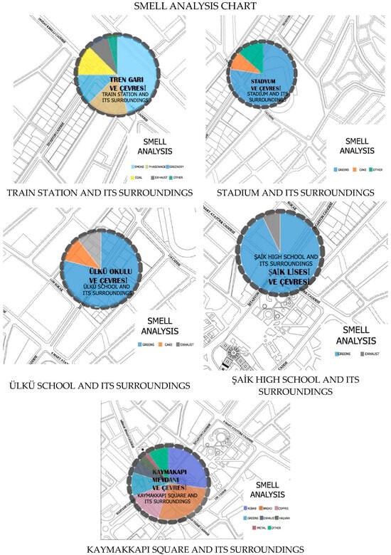 When evaluated in terms of the taste elements, the “burnt (smoky)” taste left in the air by the smell of toxic substances, such as soot in the Isparta Station building and its surroundings, was detected. “Clean air” representing the freshness and relief felt by the green texture in the stadium and its surroundings was detected. “Cake” in Ülkü Primary School and its surroundings was detected. The taste of “fresh air” was detected in ŞAİK High School and its surroundings, and the taste of “kebab and bread” was detected in Kaymakkapı Square and its surroundings, located in the city square.