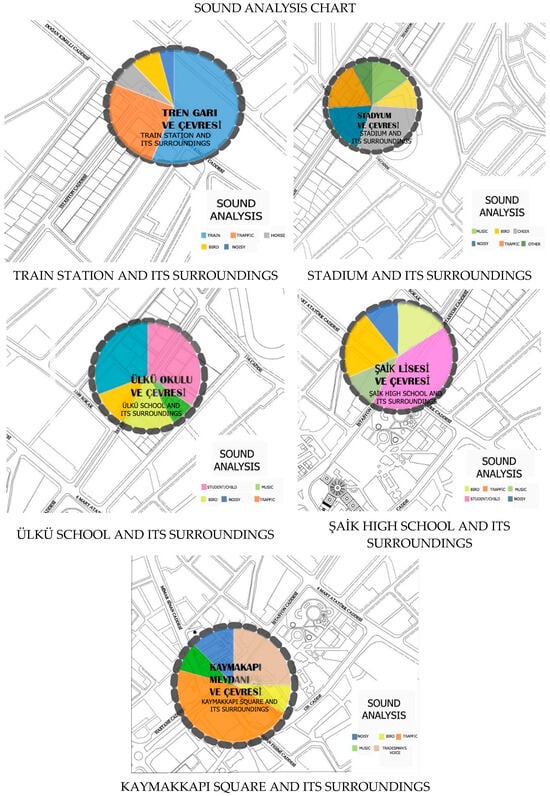 In the evaluations made in terms of the sound elements, the “traffic” sound in and around the Isparta Station building, the “cheering” sound in the stadium and its surroundings, the “student/child” sound in Ülkü Primary School and its surroundings, and the “traffic” sound in ŞAİK High School and Kaymakkapı and their surroundings were the most frequently heard sounds.