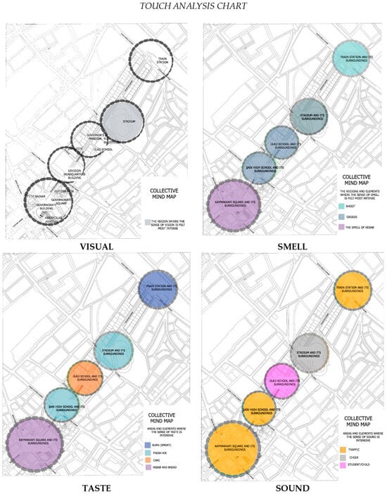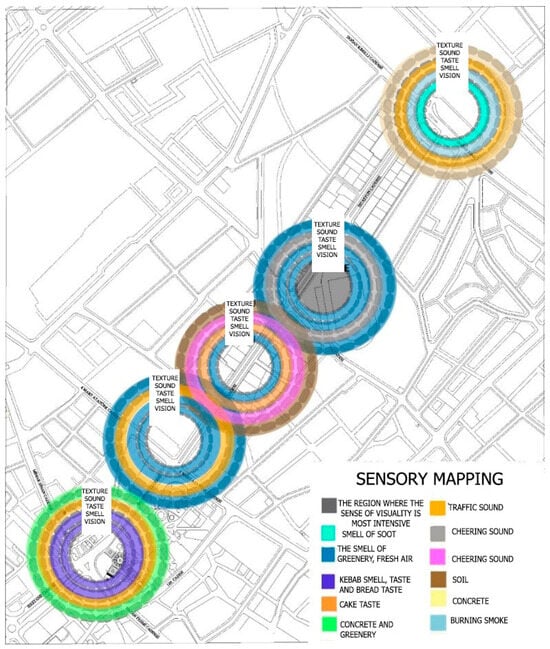 The expression of spatial perception acquired as a result of spatial experience, in which senses other than vision also participate in the interaction, is important for this study. Therefore, it is determined whether factors, such as perceived sound, smell, and taste, are significantly present in experiences. Legends were created on how perceived sensations could be represented in the visualization of the analyses. The results obtained are shown schematically with mapping. Taste analyses (lokum, tea, dirgit, kabune, etc.), hearing/sound analyses (bird sound/horn sound/train sound/child’s voice/noise/silence, etc.), and touch analyses (soil/foliage/keystone/kövke1/stone/concrete, etc.) were carried out. Various data were obtained in line with the answers.