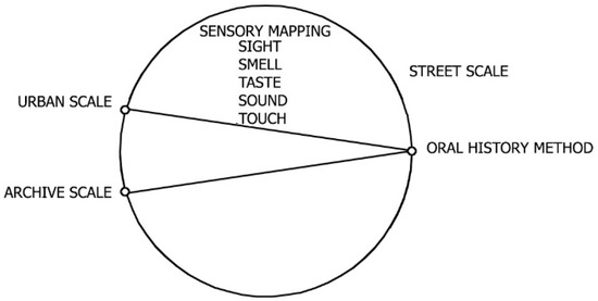 Among the data obtained from the literature research and archive scanning, sensory data, including sight, smell, taste, sound, and touch, are also included in the data from verbal narratives at the street scale. The detection of common points in these data supports the results of the study. A schematic representation of the intersection of the methods is included in Figure 8. The inferences expressing these relationships are shown in Table 3. As a result, both visual and verbal data were used to analyze the reflections of memory on urban space. The data obtained from the literature review and verbal narratives were considered within the framework of two main scales, and their common aspects were determined and presented in tables. These two scales were determined as city scale and street scale.