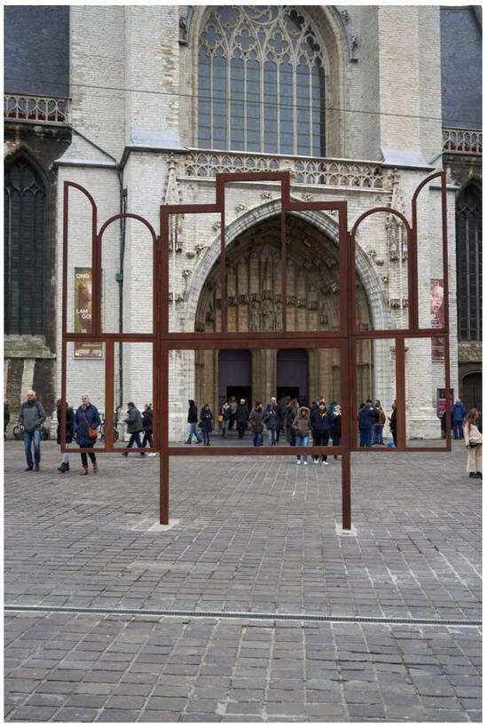 In 2020, Altar, was installed in Ghent outside the main portal of Sint-Baafs (Figure 6). It was part of a larger exhibition of three artists whose works were also inspired by the Ghent Altarpiece: Martin, Lies Caeyers (b.), and Sophie Kuijken (b.). Here, at this particular site, Altar underscores a key element in Anthony Smith’s development of localized identity. Altar frames the familiar topography of Ghent when looking out from the portal of Sint-Baafs (Osborne 1992). It also serves to frame Sint-Baafs itself, the container of the Ghent Altarpiece in which the city is depicted.
