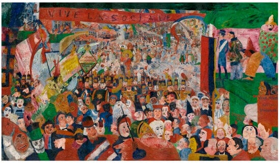James Ensor (1860–1949) remains a prominent name from this period. He was born and lived in Oostende, the seaside town in West Flanders. His early work looked to Rubens for inspiration, but he soon turned to French Impressionist brushwork. Despite Rogier’s intent to internationalize the Brussels salon with French and French-inspired modern art, Ensor’s pieces were still too much of a challenge for Belgian tastes. His Entry of Christ into Brussels (1888), a parody on Christ’s entry into Jerusalem, was rejected from the Brussels Salon 1883 (Figure 4). The ludicrous assumption that Christ would even enter Brussels—in the year 1882, no less—was no more shocking than the smeared and garish colors and the inability to locate Christ himself in the melée.
