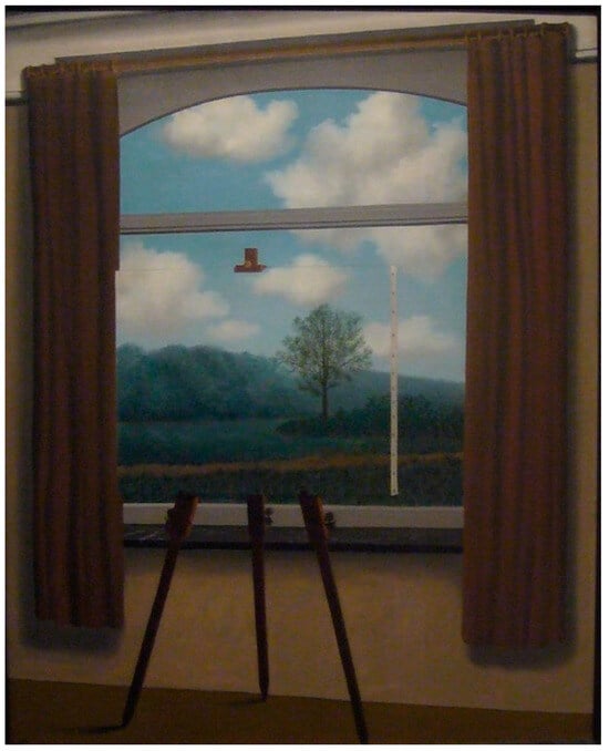 Belgian Surrealism emerged with the publication of Correspondance in 1924. Correspondance was a self-published periodical that challenged the notions of André Breton’s Manifesto of Surrealism of 1924. The distinction between Paris and Brussels was underscored in the inter-textual exchanges between Belgian surrealism and its own traditions and between Flemish and Walloon traditions and identities. Rene Magritte (1898–1967), the name most associated with Belgian Surrealism, never agreed with the French interest in a psychic conception of art. He distanced himself from the importance given to the unconscious and the use of dreams as sources of inspiration, as derived from Freudian psychoanalysis. He identified as a realist, or a hyphenated “sur-realist”, who always situated his work at the level of the “perceived real” (Spoiden 1997, p. 144). Magritte’s work elicits questions about the nature and boundaries of reality and representation. The Human Condition (1933) questions the veracity of what the viewer sees (Figure 5). In this painting within a painting, one vision is real and the other a representation. Lipinski has written that, by employing simulation, Magritte sought to “bring about an encounter, an affective experience, of wonder, surprise, disbelief, confusion or bewilderment” (Lipinski 2000, p. 211). This places The Human Condition in dialogue with Herbert and Jan van Eyck’s Ghent Altarpiece. At the time of its conception, the altarpiece represented a new artistic vision, in which the idealization of the medieval tradition gave way to an exacting observation of nature and un-idealized human representation. The van Eyck’s new use of perspective took viewers on a mystical journey conflating the real and the unreal within an expansive, exotic, but also localized Flemish landscape. It was, in the manner of the later Magritte, a window into another world.