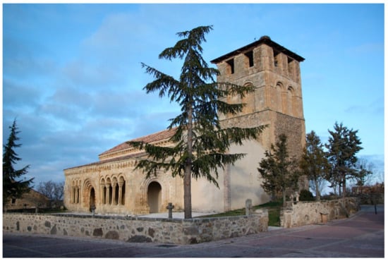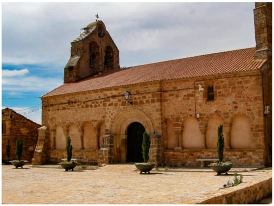 This unique type of structure was immensely popular for more than a century and a half, coinciding with a period of intense conflict in Iberia between the Christian and al-Andalus kingdoms. Eight out of every ten preserved structures are distributed throughout the eastern half of the historic Castilian Extremadura, that is, the present-day Provinces of Segovia, Soria, and Guadalajara, with occasional extensions into the Provinces of Ávila, Madrid, Burgos, and La Rioja, among others. Chronologically, the oldest example is that of the Church of San Miguel in San Esteban de Gormaz (Soria) dated by an inscription to 1081 (Ortego Frías 1957). The later cases, which could include some around Segovia and Sigüenza (Figure 2), bear stylistic features compatible with post-1200 dating (Ruiz Montejo 1988, pp. 255–56; Salgado Pantoja 2010b).