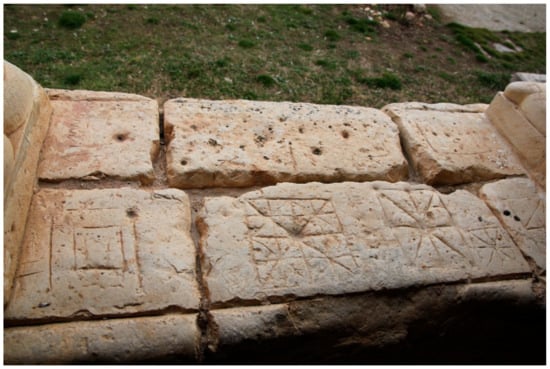 It is likely that the porticoes and the exterior circuit of the churches also witnessed ordeals, or trials by God, as these traditions, despite their reprobation, were still common in Castile (Terradas Saborit 2008, pp. 624–25). More notable was their use, despite being strictly forbidden, for leisure activities. The aforementioned Synod of Avila (1481) refers to certain recreations such as the discus throw or the shooting of crossbows that at times led to injury or death, or to games such as pelota, dice, cards, and boards often involving gambling (García García 1993, p. 133). Close observation of the walls of these porticoed structures reveals traces of these pursuits (Figure 9), notably graffiti at Orejana (Segovia) and Pinilla de Jadraque (Guadalajara), and alquerque boards carved into stone at Fuentidueña and Perorrubio (Segovia) (Salgado Pantoja 2010a, pp. 44–46; Barrera Gordillo 2015).