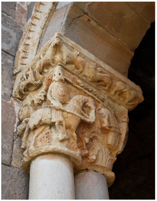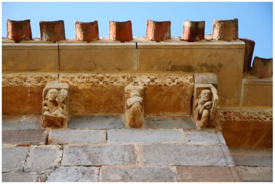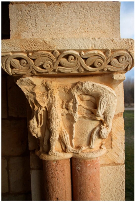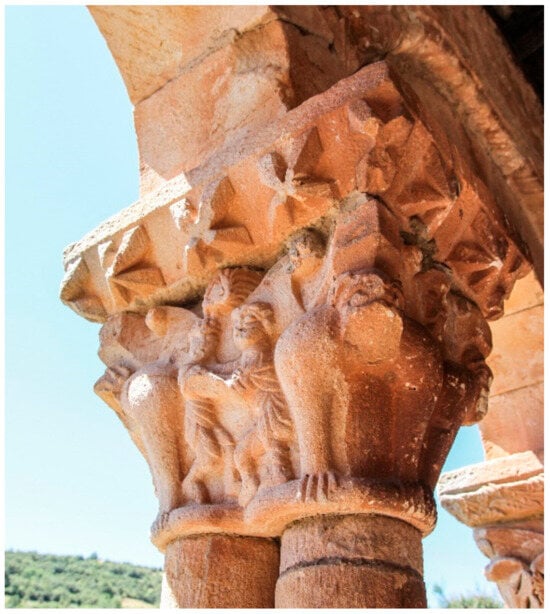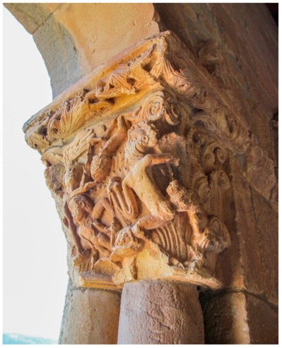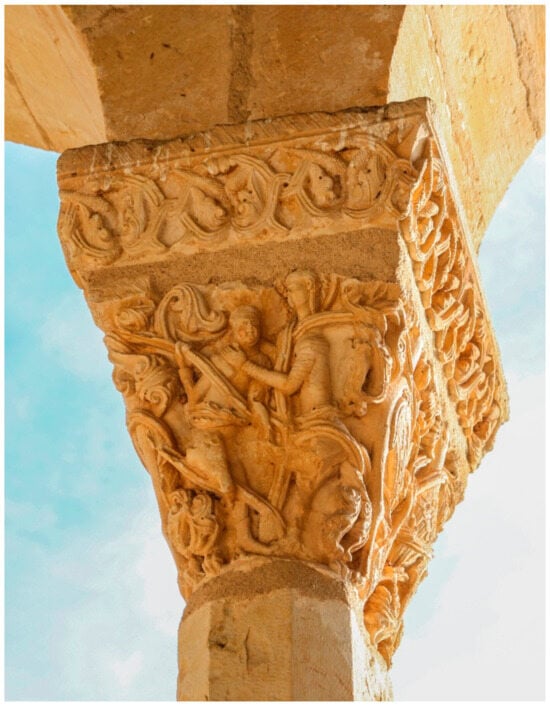 The accessible, protected, and prominent character of porticoes not only influenced the definition of their religious or civic functions but also had a significant impact on the configuration of their iconographic repertoires. Aware of the communicative power of imagery, the promoters of these features selected those elements most suitable to instruct and persuade the congregation, directing them towards salvation. The predominant medium was sculptural relief applied to relatively hard stone capitals, corbels, imposts, and metopes. However, certain churches such as San Martín de Arévalo (Ávila) resorted to polychrome fresco murals (Figure 11).