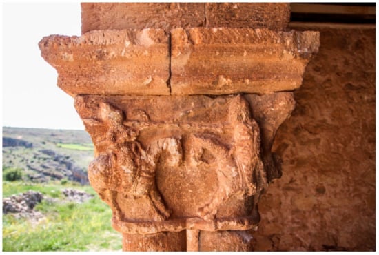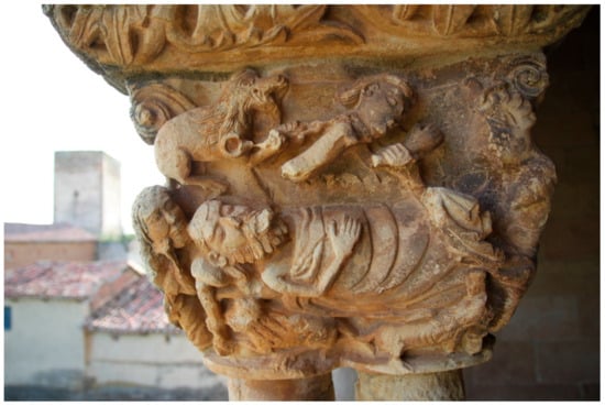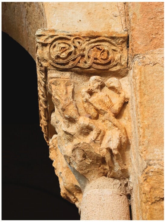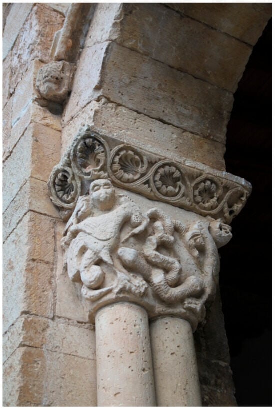 It must be noted that the iconographic schemes of porticoes are usually not as well defined and structured as those found on the most outstanding façades or cloisters of international Romanesque architecture. The construction of these structures required a considerable financial investment on behalf of their promoters, which meant that their decorative sculptural repertoires were often subjected to limitations imposed by the scarcity of resources. Sometimes, as seen in Vizcaínos de la Sierra and Jaramillo de la Fuente (Burgos), in Omeñaca and Villasayas (Soria), or in Orejana and Grado del Pico (Segovia), the sculptors simply replicated, often quite randomly, the models used in major Castilian works of significant artistic importance, such as the monastic cloister of Santo Domingo de Silos (Boto Varela 2000, pp. 246–51). Added to this were other more relevant factors such as the degradation, transformation, and partial or total destruction suffered by many from the sixteenth century onwards. However, these circumstances do not prevent the identification of certain recurring themes or scenes that can be broken down into four categories: Biblical and Christological episodes, plant representations, events of medieval daily life, and finally, a vast repertoire of moralising images expressing, through a variety of means, the struggle between Good and Evil.