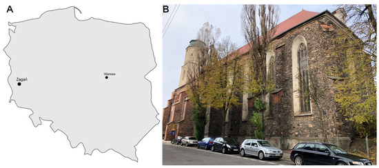 (A) Poland, location of Zagan (compiled by the authors); (B) St. Peter and Paul’s Church, Zagan—view from the southeast (photo by the authors).