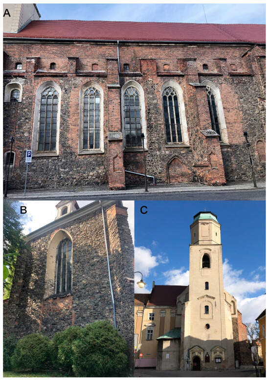 (A–C) View of St. Peter and Paul’s Church, Zagan, from the outside: (A) Southern facade; (B) Eastern facade; (C) Western facade with Baroque tower (photos by the authors).